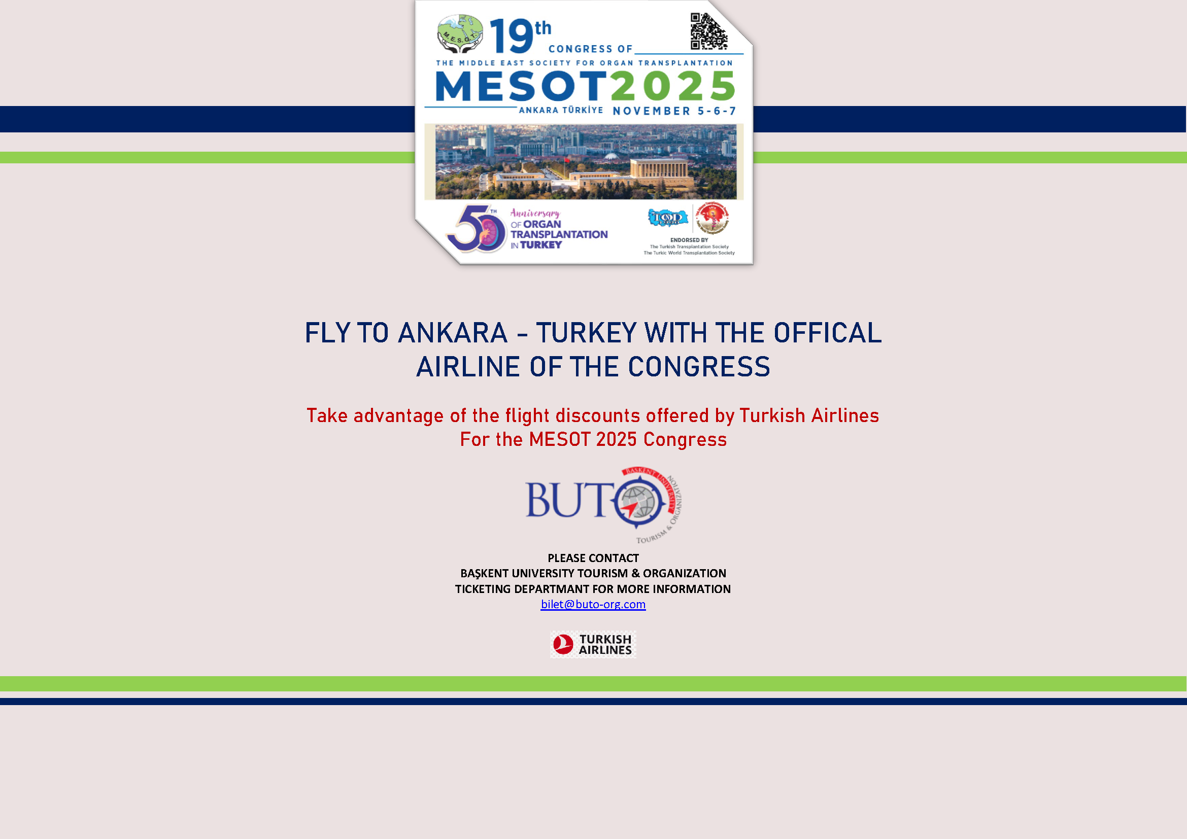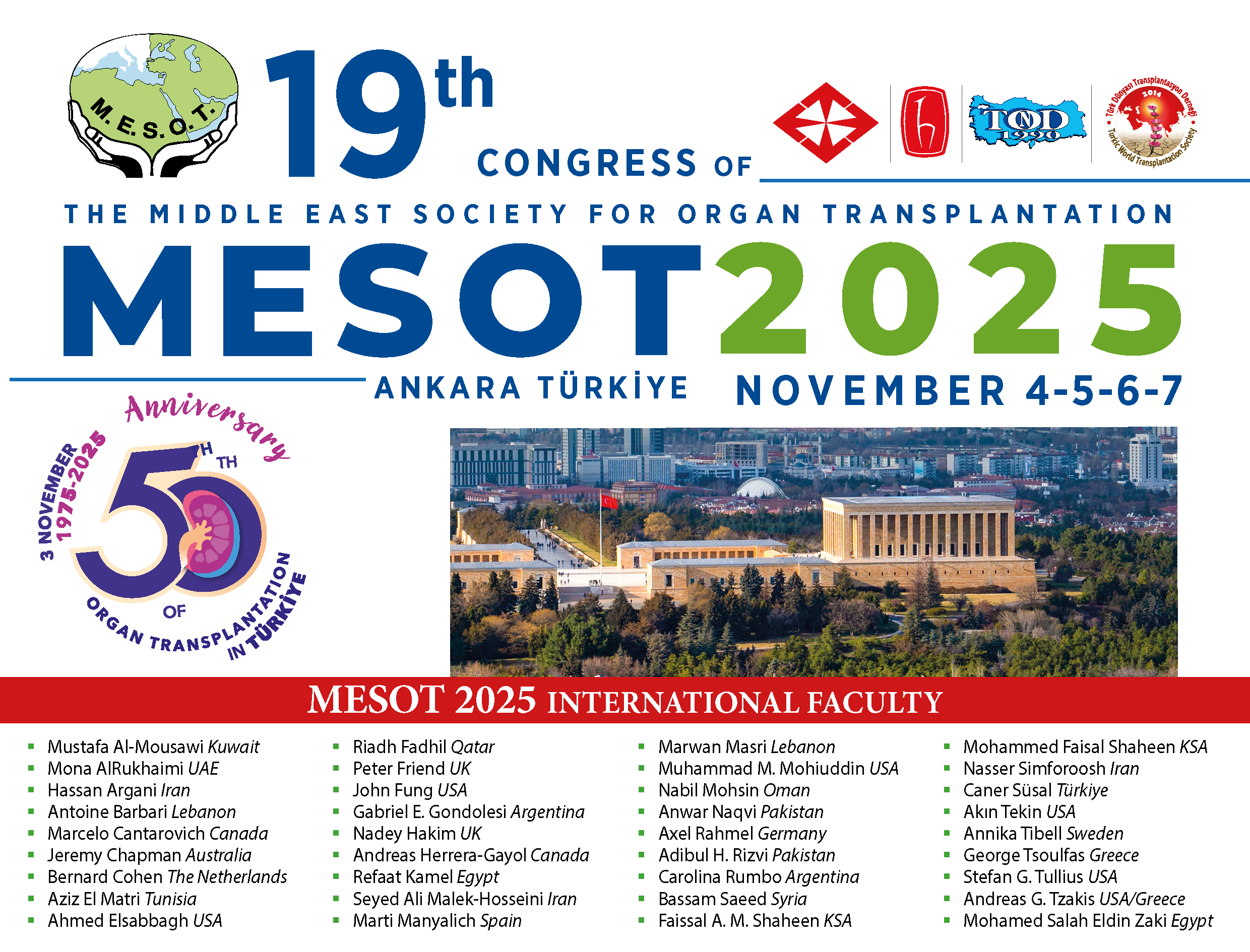 It is a great honor and privilege to announce the 19th Congress of the Middle East Society for Organ Transplantation (MESOT) to be held on November 4-7, 2025 in Ankara, Turkey.